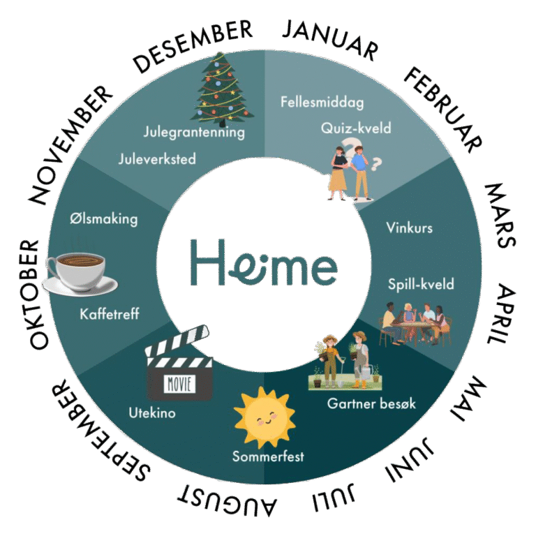 Gjennom samarbeidet med Heime kan du bli med på både små og store sosiale aktiviteter gjennom hele året. Her er noe av det som kan stå på programmet:
